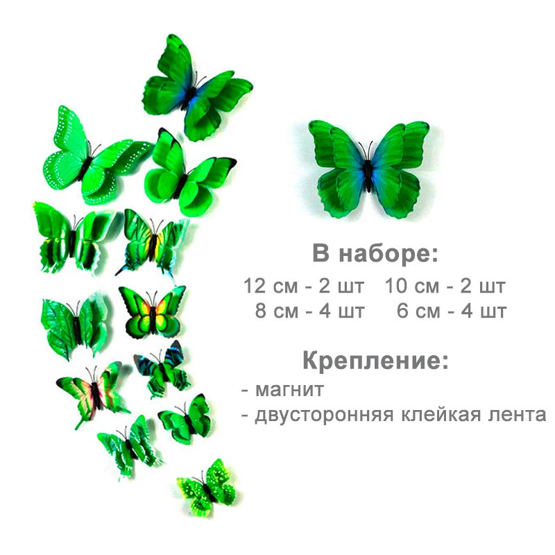 Бабочки выполнены из пластика, крепятся с помощью магнита, так же в комплект входит двухсторонняя клейкая лента.