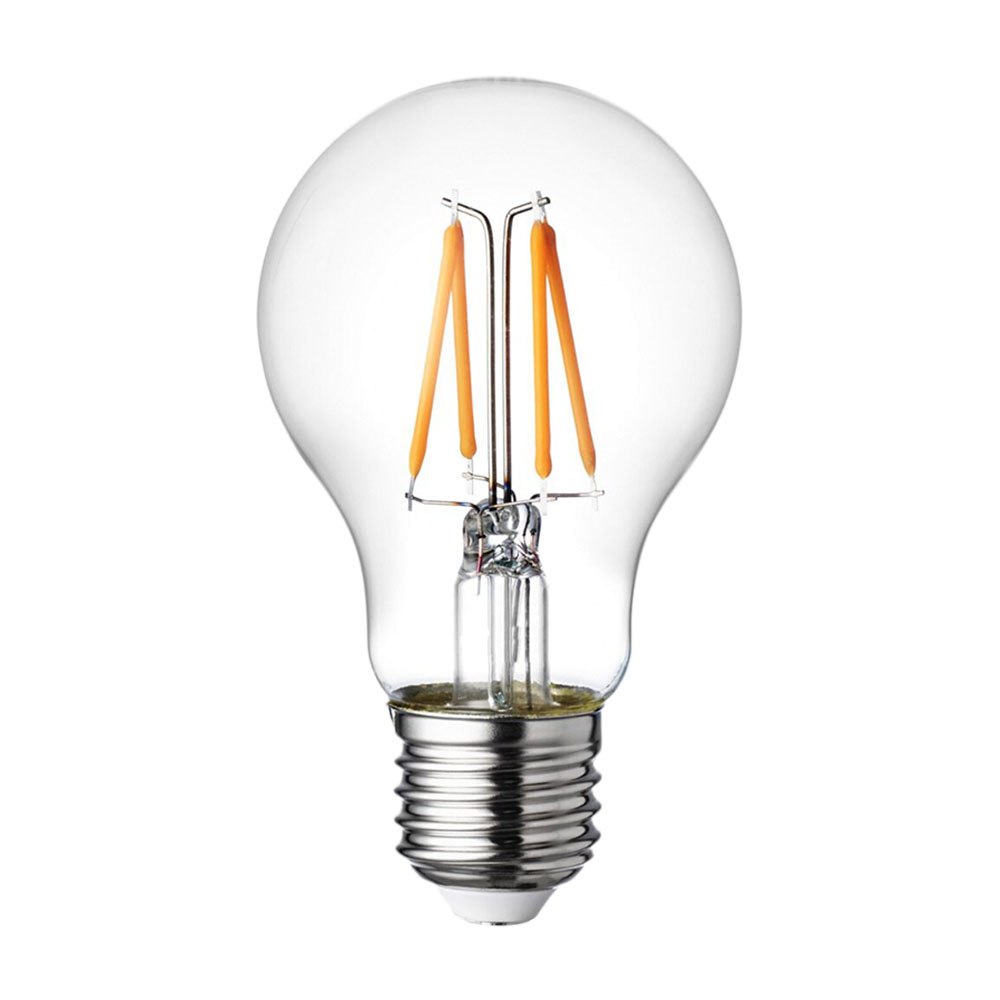 Лампа светодиодная A60 E27 W4 с теплотой свечения 2700 K.  Характеризуется высокой энергоэффективностью и потребляет до 90% меньше электричества, в сравнении с классическими лампами. Могут эксплуатироваться как внутри, так и снаружи помещений. Срок службы – до 25 000 часов. Потребляемая мощность 2 Вт/4 Вт/8 Вт.