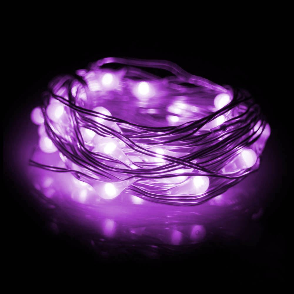 Нить "Роса" серебро, 2 м х 20 диодов, от батареек, фиолетовый