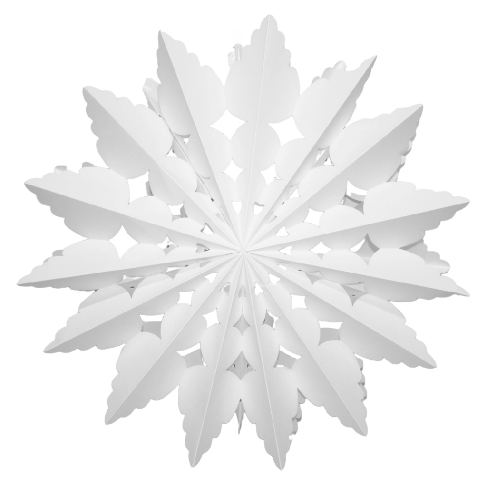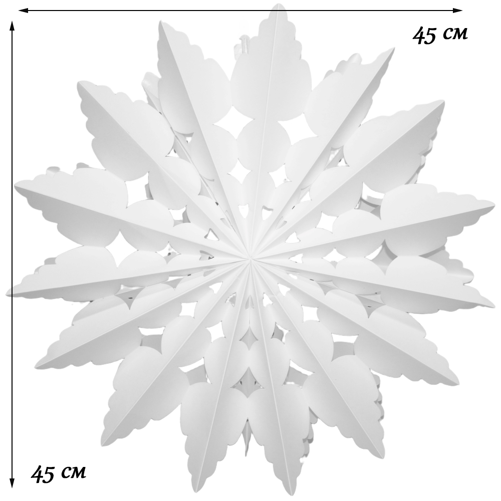 Снежинка на липучках размером 45 см, белого цвета, изготовлена из высококачественной бумаги.