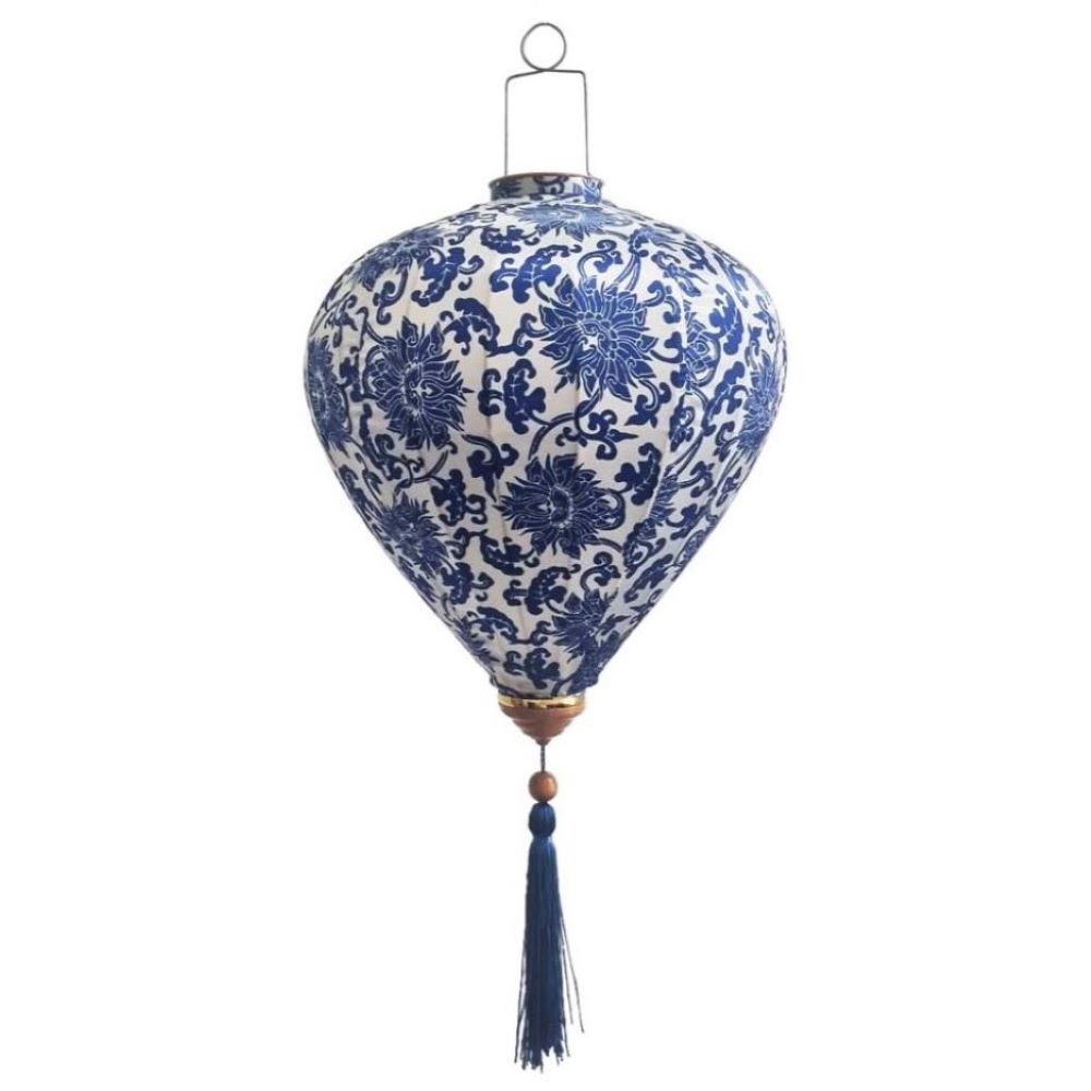 Коллекция подвесных фонарей ручной работы. Конструкция из шелкового полотна с цветочным орнаментом, металлического каркаса и подвесной системы. Модель в бело-синей цветовой гамме.