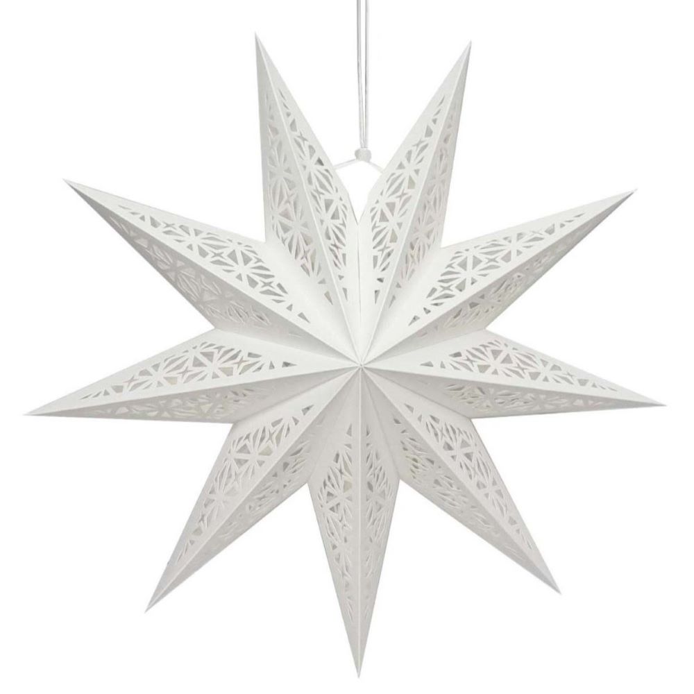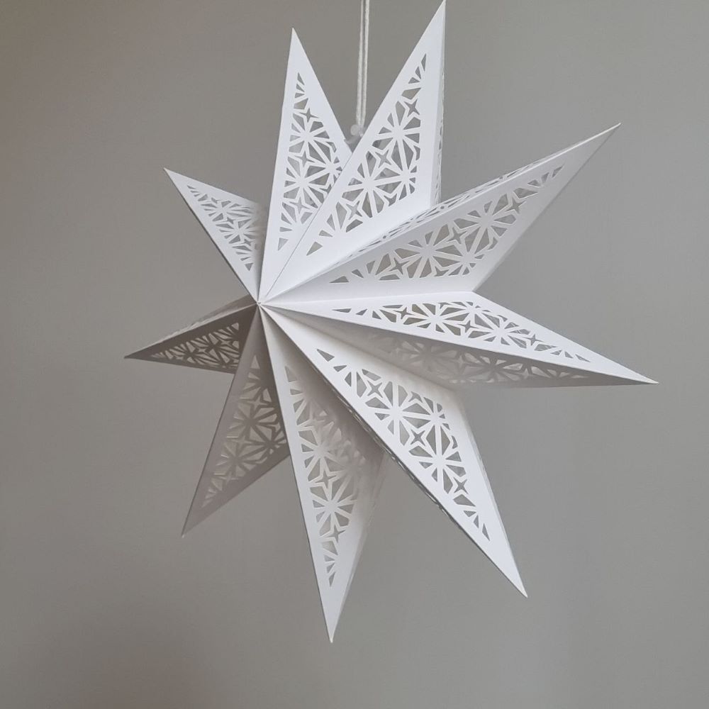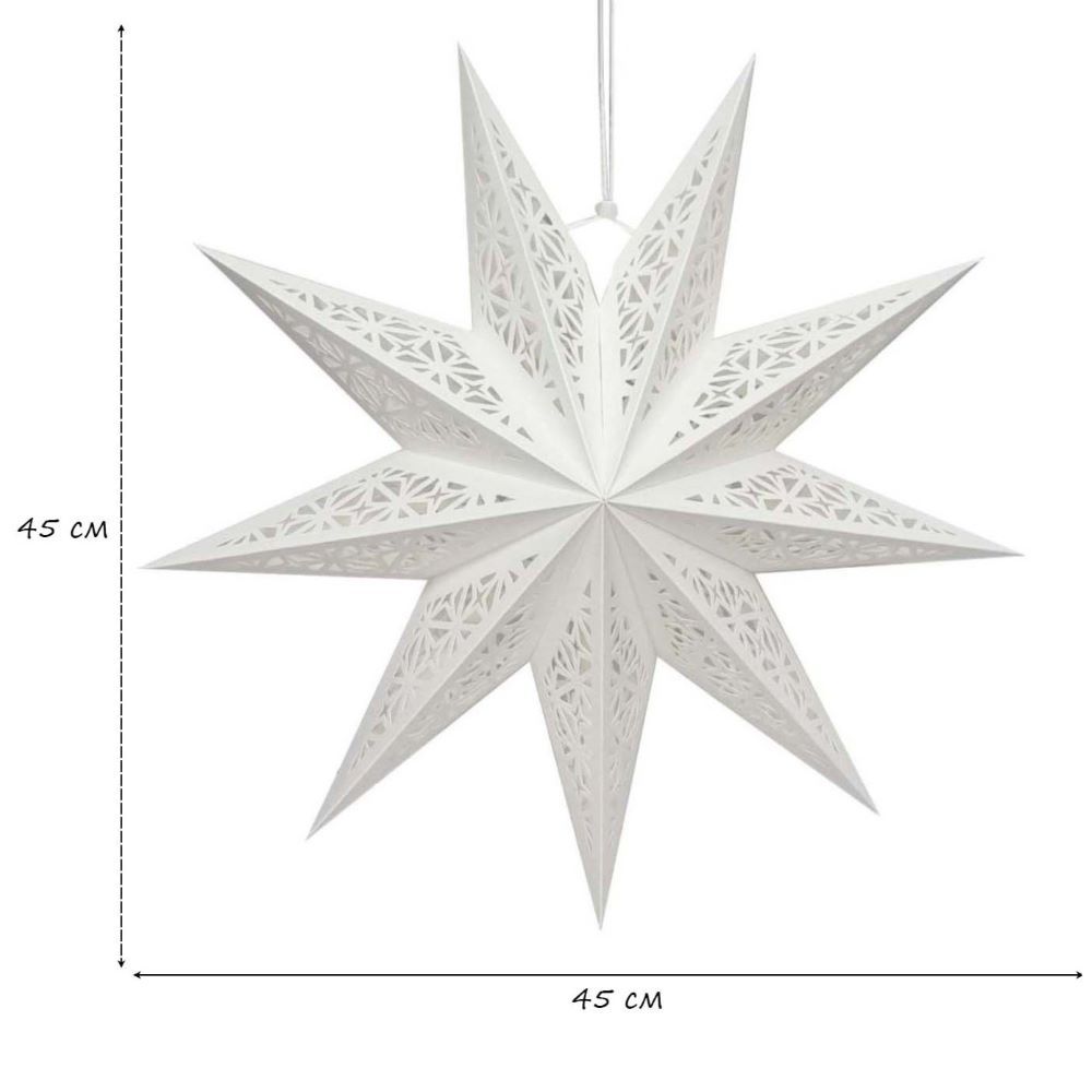 Объемная 3D-звезда 45 см изготовлена из картона с перфорацией в виде точек и мелких звезд.